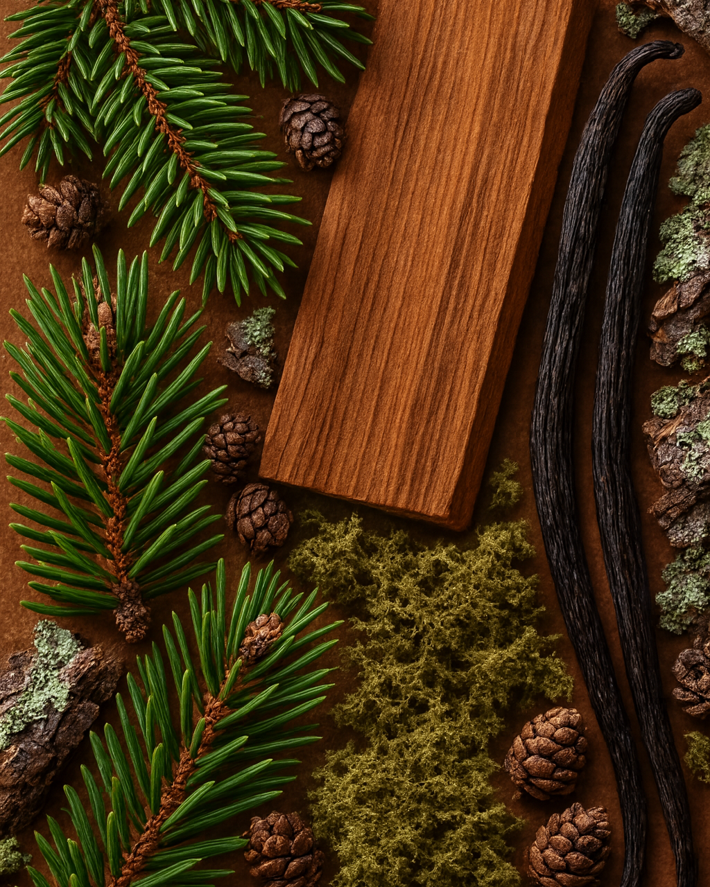 - Basnoter: gran, mugo tall, cederträ, ekmossa, vaniljebär