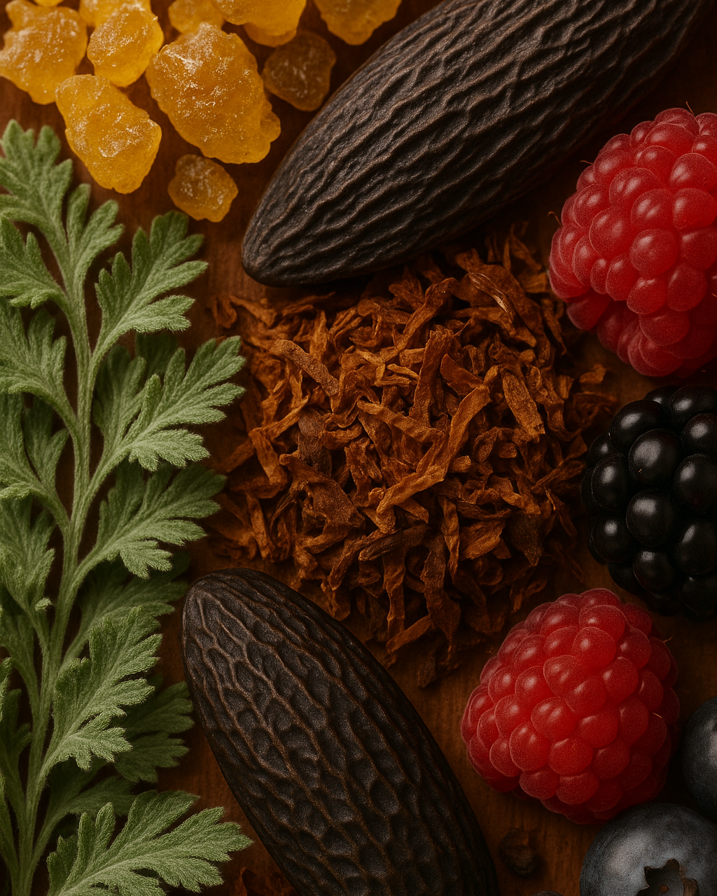 I hjärtat blir doften aromatisk och fruktig: granresin, absint och söt tobak möter tonkaböna och bär, och skapar en varm, omfamnande kropp med elegant komplexitet.